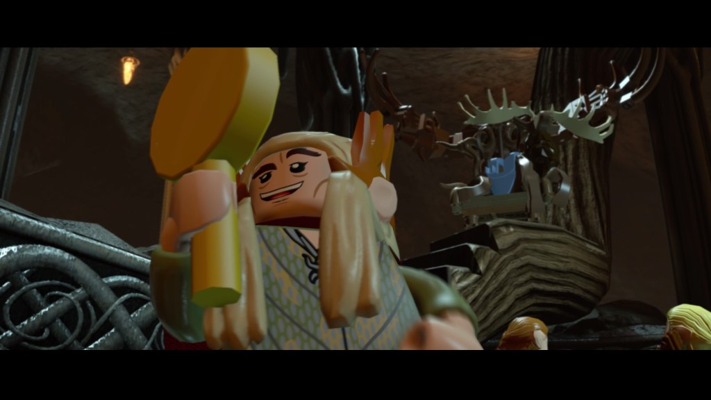 J’ai beaucoup d’affection pour les jeux Lego, bien que je n’ai arpenté que trois de leurs licences : Harry Potter, Jurassic Park et le Hobbit. Un joueur armé de préjugés pourrait se méfier de ces produits dérivés à la vocation parodique. Or, il s’agit de véritables bijoux. Comme toute parodie digne de ce nom, le Hobbit utilise le cadre et les personnages des films (et non du livre) dont il veut se moquer. C’est avec un grand plaisir que l’on retrouve les costumes et décors du Hobbit, mais aussi les musiques et le doublage officiel (en VO comme en VF). Je tempérerais quelque peu tes attentes en précisant que le jeu ne suit que le cheminement des deux premiers films. Il est sorti avant La Bataille des Cinq Armées, qui aurait dû faire l’objet d’un DLC, n’ayant malheureusement jamais vu le jour. L’humour est l’un des maîtres-mots de cette (grande) aventure Lego. Les personnages imaginés par J. R. R. Tolkien sont caricaturés, tant au niveau de leur physique que de leur comportement. De nombreuses scènes des films sont revisitées, avec un tout autre registre. Or, le décalage prête à sourire. Le jeu Lego va estomper l’aspect solennel de certaines scènes à dessein, lorsqu’il ne se permettra pas des anachronismes, comme lorsque tu affubleras Bilbon d’une perruque disco. En dépit de qualités indéniables, Le Hobbit n’est pourtant pas le jeu Lego m’ayant fait le plus rire. Je regrette l’époque où les jeux Lego étaient muets, comme c’était le cas dans la saga Harry Potter. Les comiques de geste ou de situation rendaient certaines scènes particulièrement savoureuses. Il serait pourtant faux de dire que la licence n’est pas sur une pente ascendante. Après tout, le level-design du Hobbit force le respect. Si les jeux Lego possèdent une quête principale, constituée de niveaux, ils disposent généralement d’un monde ouvert, jonché d’objets et de quêtes secondaires. Les reconstitutions de Poudlard ou du Jurassic Park étaient impressionnantes, et la reproduction de la Terre du Milieu n’est pas en reste. Le Hobbit permet d’explorer une map immense, de jour comme de nuit, où sont situés la plupart des lieux cultes imaginés par Tolkien. Traveller’s Tales n’a pas ménagé ses efforts pour que le gameplay épouse harmonieusement le genre des films originels. Le concept de quêtes annexes n’était par exemple pas aussi développé dans Lego Harry Potter. Les PNJs ont de réelles attentes que tu devras honorer. Il y en a beaucoup trop, à mon goût, mais c’est un autre débat. La plupart des collectibles sont des schémas ou de précieux (non, pas celui-là) matériaux de construction. Il est bien naturel que ladite construction ait une part prépondérante dans un jeu Lego, et plus encore dans Le Hobbit. Les nains ne sont-ils pas connus pour être de fiers forgerons ? Tu l’auras compris, Lego Le Hobbit est vraiment ambitieux en terme de reconstitution, de gameplay, comme de durée de vie. Malheureusement, une reproduction de plus en plus fidèle ne rend pas forcément la parodie meilleure, au contraire.