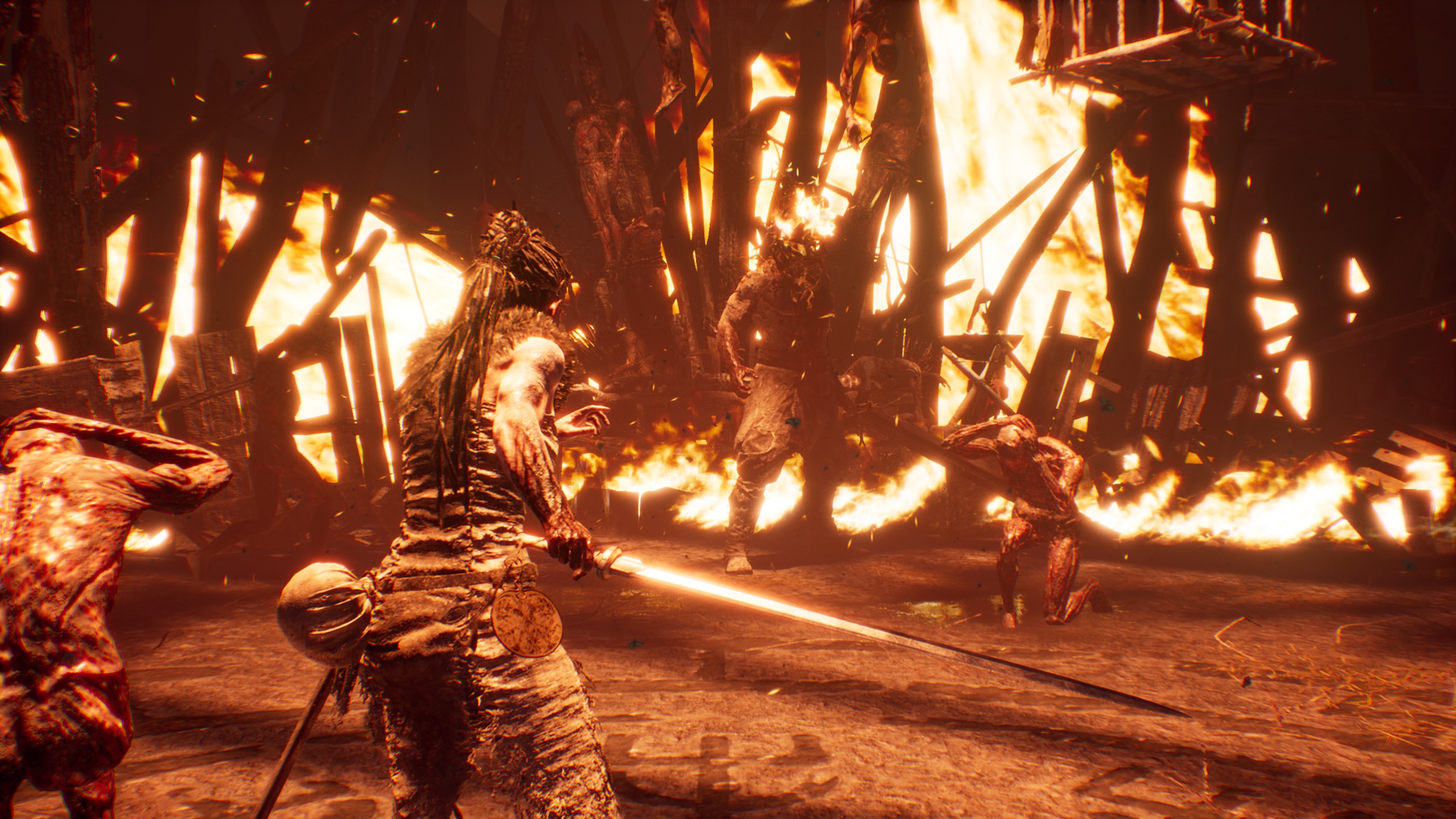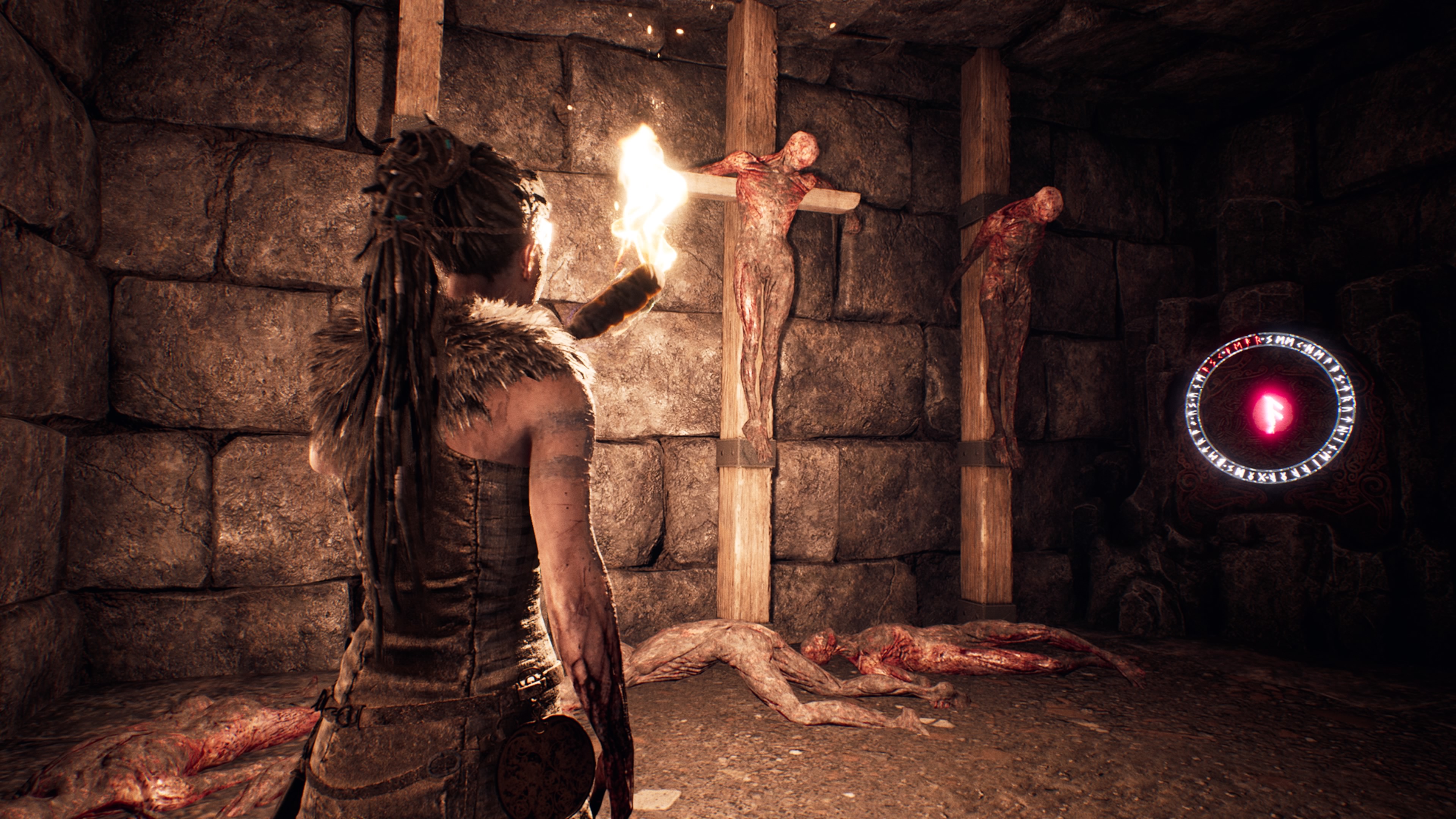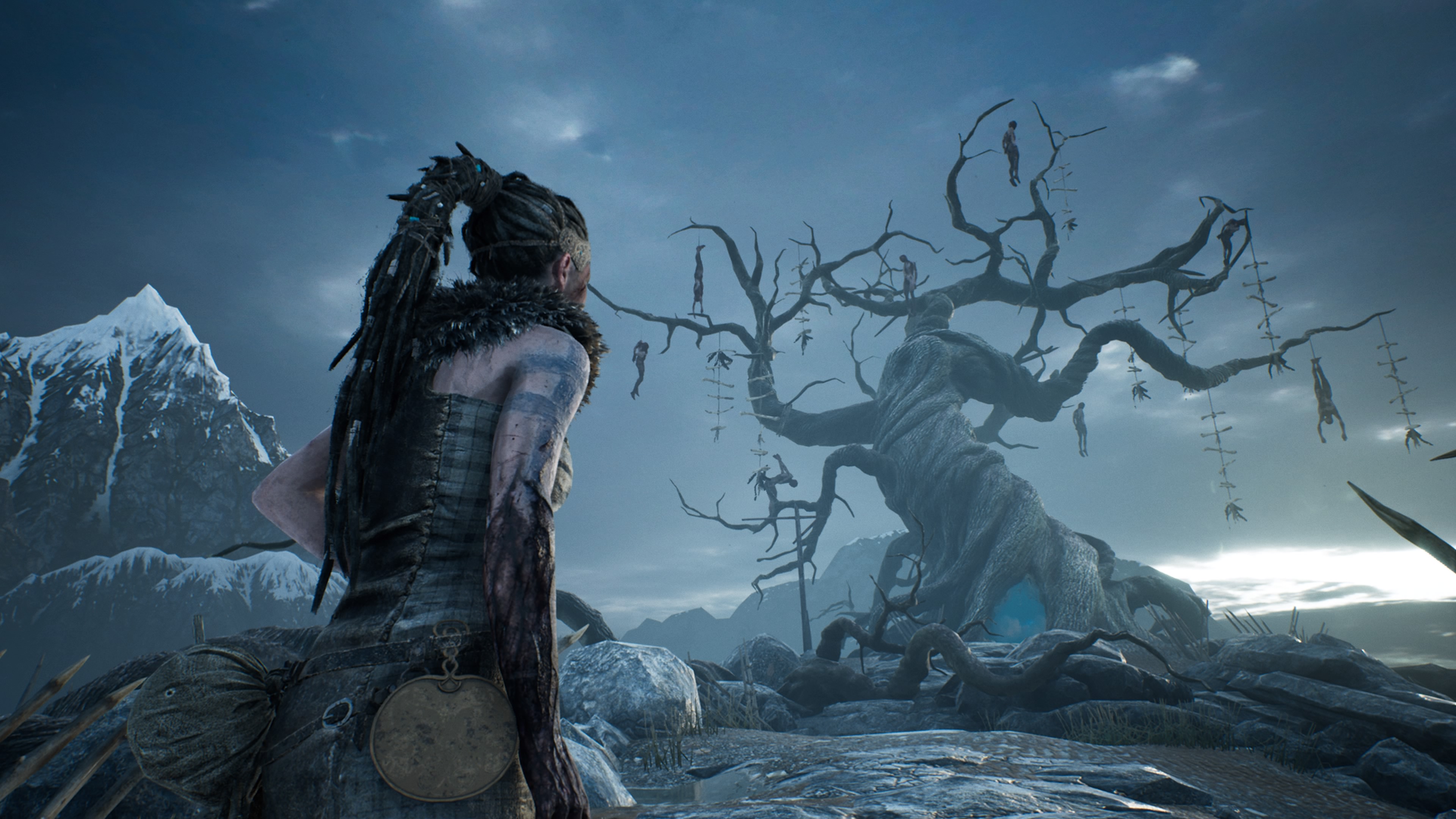 Senua grandit dans l’ombre de son père, qui n’a de cesse de la stigmatiser et de l’ostraciser. A ses yeux, la jeune fille est maudite et ne peut apporter que le malheur dans son sillage. On comprend, progressivement, que la voix de Zynbel est l’une de celles harcelant le plus Senua. Il s’agit de la voix des ténèbres, qui, prétendant agir pour sa sécurité, la confronte aux défis les plus éprouvants. Senua est parvenue à s’émanciper de l’emprise de son père, en rencontrant Dillion et en tombant amoureuse de lui. Le jeune homme n’a que faire de ses différences et essaie de l’aider à les accepter. Malheureusement, Senua, encore marquée par l’éducation de son père, reste persuadée qu’elle est maudite. Suite à une épidémie frappant la tribu, elle décide de s’exiler dans les bois. Lorsqu’elle revient, elle constate que le village a été mis à feu et à sang par les vikings. Ceux-ci ont tué Dillion, en lui infligeant la pire des tortures : celle de l’aigle de sang. Ce nouveau traumatisme incite Senua à perdre tout contact avec la réalité.